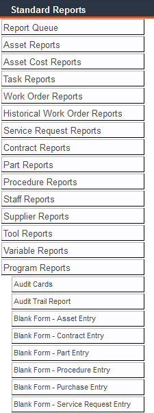 FaciliWorks includes printable data collection worksheets that will allow you to compile organized, complete records to enter into FaciliWorks. Navigate to Reports -> Standard Reports -> Program Reports and select a Blank Form worksheet.