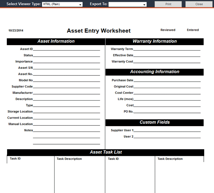 You may wish to categorize assets by type so that you can later quickly generate reports by type. You can also generate reports by asset description, so you may want to enter some common information for each kind of asset.