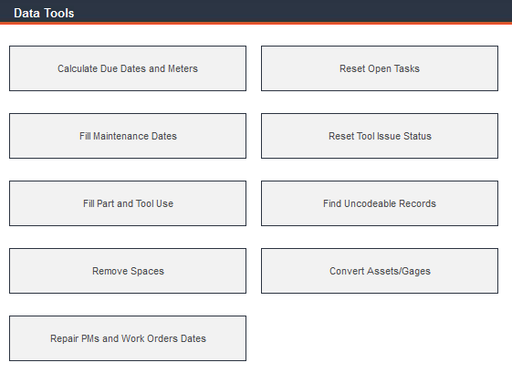 The Data Tools menu contains utilities that are intended for one-time use. Use these features only when instructed to do so by Technical Support or FaciliWorks documentation (such as update notices).