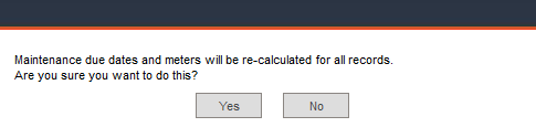 This utility recalculates all maintenance due dates. For example, if you change the maintenance frequency for punch presses from 60 days to 90 days and you have 25 punch press records, it would be easier to update the due dates by running this utility than to manually alter each of the 25 records. The following window appears when clicking the Calculate Due Dates and Meters button: