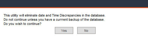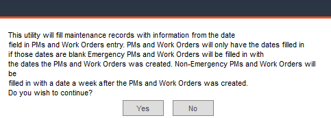 This utility checks all of your preventative maintenance and work order records for valid dates and times. If a record is missing one of these fields, the program will insert the required information. The following window appears when clicking the Repair PM and Work Order Dates button: