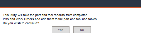 Use the Fill Part and Tool Use utility to fill in all of your part and tool records with the Where Used information from all non-archived, completed work orders. The following window appears when clicking Fill Part and Tool Use: