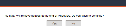 This utility should be run once after importing data from another program. This feature removes unnecessary trailing spaces from Asset IDs that may have been used by your old program. The following window appears when clicking the Remove Spaces button: