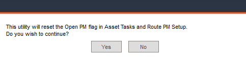 Use this utility to update the Open PM checkbox in each of your task records. This field can also be altered manually from within the Assets -> Task List -> Information sub-tab and the Route Preventative Maintenance Setup -> Asset List -> Information sub-tab. The following window appears when clicking the Reset Open Tasks button: