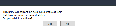 This utility corrects problems with imported records that show that a tool has been received even though it has not been issued. Do not run this tool unless instructed to do so by Technical Support. The following window appears when clicking the Reset Tool Issue Status button: