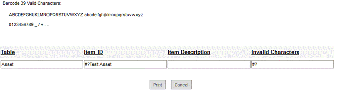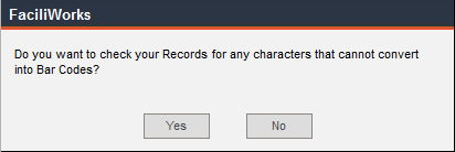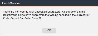 In FaciliWorks, you can print barcodes for parts, tools, assets and employees. Run the Find Uncodeable Records utility to check all of your ID numbers for parts, tools, assets and employees to see if any of them contain characters that cannot be converted into a barcode. If the utility finds any uncodeable records, it will provide a printable list of them. If no uncodeable records are found, a dialog box will appear to confirm this.