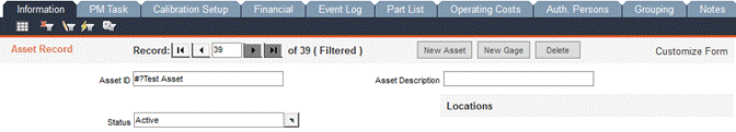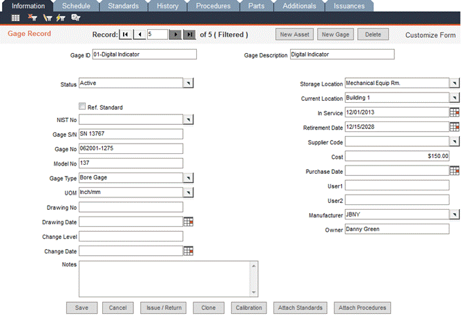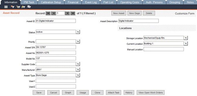 For example, as shown in the image above, record 01-Digital Indicator is currently an asset record, but should be a gage. The record’s Data Administration -> Assets -> Information tab appears as follows:
