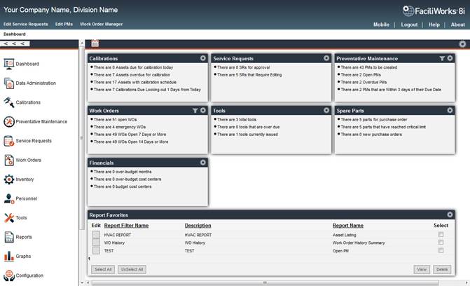 Upon successful login, FaciliWorks opens to the Dashboard.