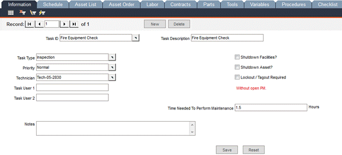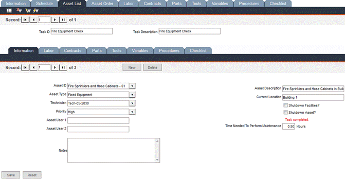 Open all sub-tabs to see that the related labor, contracts, parts, tools, variables, procedures and checklist records have been carried forward from the original asset to the newly added asset in the Asset List.