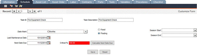 Enter the maintenance frequency in the Date Maint fields (type the numeric value in the left-hand field and use the pop-up list in the right-hand field to select the unit of measure.)