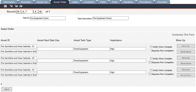 Click the Asset ID pop-up and make a selection. All related fields (Asset Description, Asset Type, Current Location, Priority, Asset User 1 and Asset User 2) will be automatically populated.