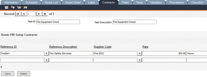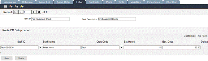 A labor record can be entered here in the Route Preventative Maintenance Setup -> Labor tab and it can be edited or deleted here as well; however, this labor record will not be visible on any of the Asset List ->Labor sub-tabs, because it applies only to the task as a whole, not to the individual assets in the Asset List.