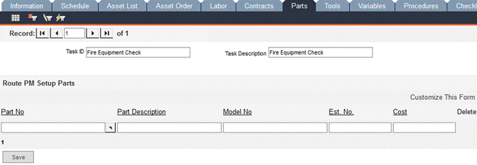 Click the Parts sub-tab. Click the Part No pop-up and select a part. The related fields will be automatically populated.
