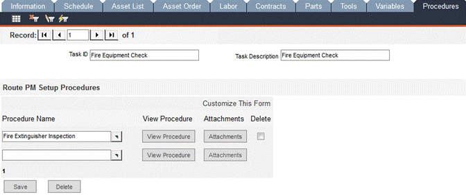 In the Procedures form, you can select one or more previously entered procedures that apply to the task. To select an additional procedure, go to the last blank record and click the pop-up menu; select another procedure name from the list of procedures. Clicking the View Procedure button will display the procedure in a separate, read-only window.
