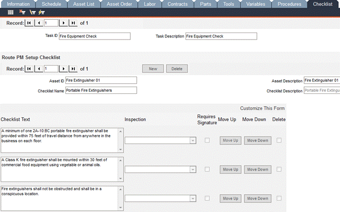 A checklist is a user-defined set of points that must be checked to complete a task. You must enter a checklist record in Data Administration -> Checklists before it can be assigned to a task. You can apply a checklist to the entire route PM here, but if you have applied checklists to individual assets within the asset list, those checklists will display here.