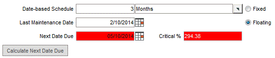 A month frequency unit is not equal to 30 days. Using month frequency units sets the next date due to the same day of the month as the last maintenance date. For example, set the Date-based Schedule to 3 months and the Last Maintenance Date to 2/10/2010. Click the Calculate Next Date Due button; the Next Date Due will be calculated as 5/10/2010 and flagged in red because the maintenance is past due.