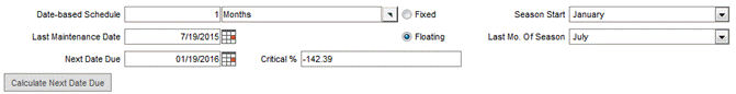To enter a Date-based Schedule, enter a numeric value in the left-hand field and select a unit of time from the pop-up list in the right-hand field. Click the Calculate Next Date Due button. The Next Date Due will be calculated. If the maintenance is past due, the Next Date Due field will be flagged in red.