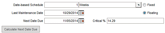 Click the Calculate Next Date Due button. The Critical % field returns a value of 14.29%. The Critical % is the ratio (in this example, 1/7) of the number of days that have elapsed since the last maintenance date (in this case, equal to 1 day) to the maintenance frequency (equal to 7 days when 1 week is normalized into days), expressed in percent form (or 14.29%).
