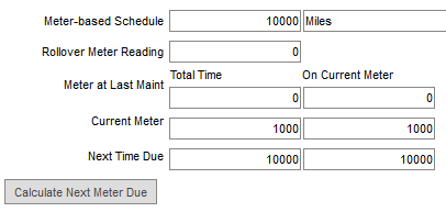 For example, enter 10000 Miles as the Meter-based Schedule. Type a value of 0 in the Meter at Last Maint field. Type 1000 in the Current Meter field. Click the Calculate Next Meter Due button. The Next Time Due will be when the meter is at 10000.