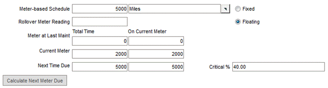 Click the Calculate Next Meter Due button. The Next Time Due field is calculated as 5000 miles. The Critical % value will be 40% (Current Meter / Next Time Due which is 2000/5000 = 40%).