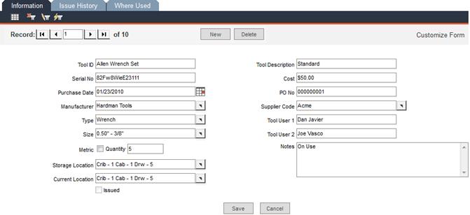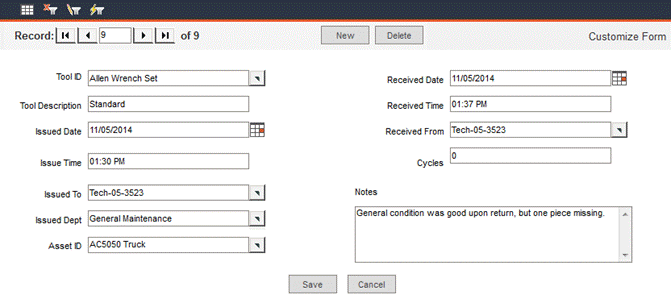 Navigate to Tools -> Edit Tool Issue and Return. This form stores information about each issuance and subsequent return of a tool. Use the record navigation bar to locate the record you wish to edit. Change any of the field contents as necessary. Click Save to save your changes or click Cancel to discard your changes.