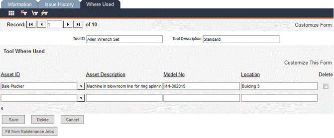 In this screen, you can manually list every asset that uses this tool. Select an Asset ID from the pop-up list and the remaining asset information will automatically display in the appropriate fields. Click Save and a new blank row of fields will appear, in which an additional asset can be entered. Click the Fill from Maintenance Jobs button to automatically insert asset information based on completed work orders.