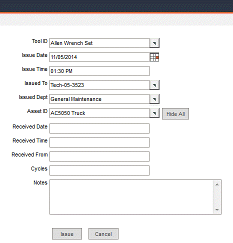 When you’re finished entering in the tool issuance information, click the Issue button to issue the tool and save the record. A Tool Successfully Issued message will appear; click OK. A new blank issue form is displayed.
