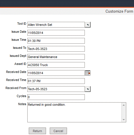The Received Date, Received Time, Received From and Cycles fields will be automatically populated upon the return of the tool.