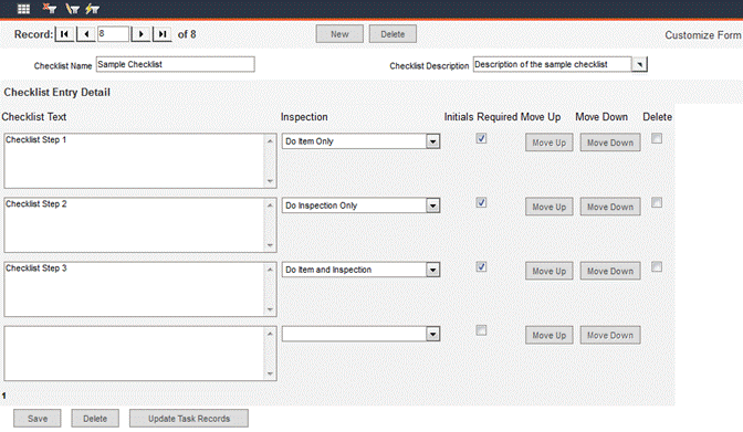 To delete an entire checklist record, click the Delete button at the top of the form.