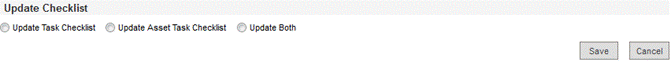 Click the appropriate radio button for the kind of update you would like to perform. You can update the checklist in associated Tasks, in Tasks associated with Assets or both. After making a selection, click the Save button in the Update Checklist pane. Click Cancel to revoke any updates.