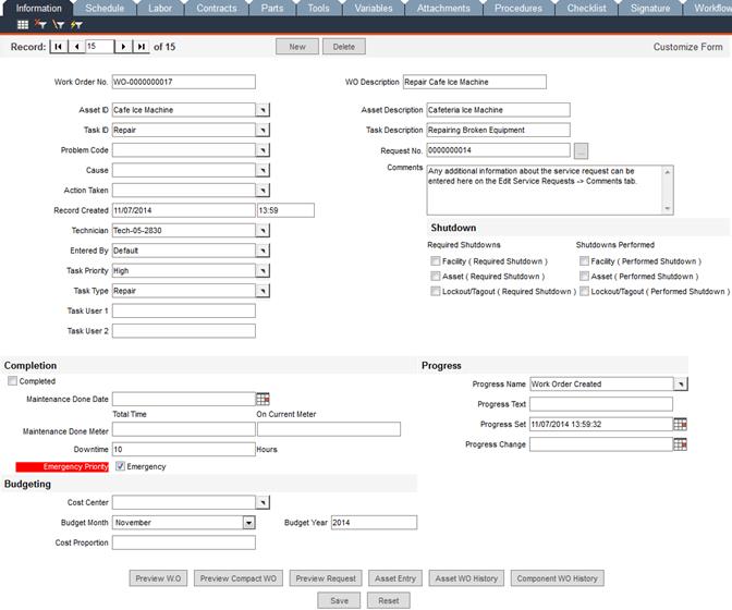 Preview Request: If the work order was created via a service request, click this button to view the service request that prompted this work order.