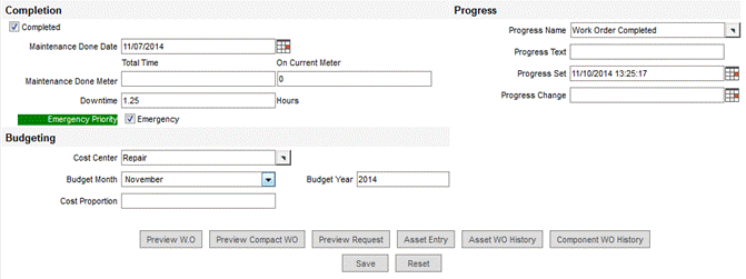 Progress Set: FaciliWorks automatically enters the date of the last change in the progress of this work order. This date can be changed manually.