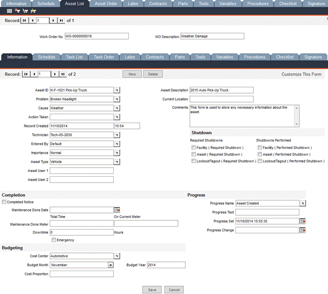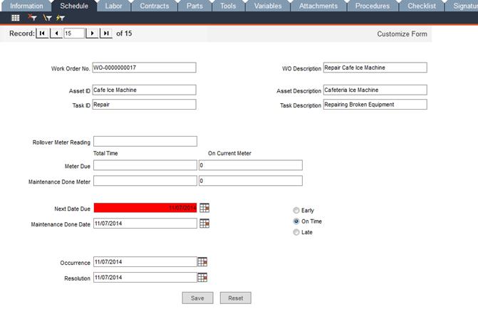 In the Schedule tab, you can view the maintenance scheduling information auto-filled from the task record. Any of these fields can be changed prior to the completion of the work order. This information becomes part of the maintenance history for the asset.