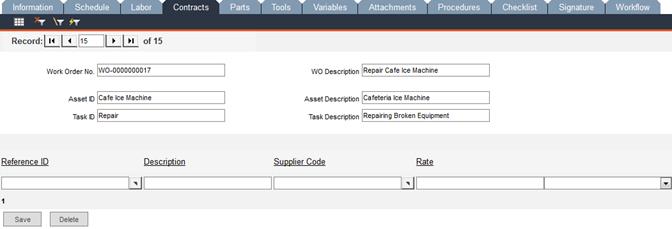 Access the Contracts tab to enter contractor information associated with the work order. Make a selection from the Reference ID pop-up list. All related fields will auto-fill from information entered within Data Administration -> Contractors: