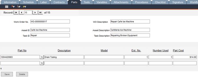 When the work order has been completed, revisit this form to enter the Number Used. FaciliWorks automatically calculates and display the total cost in the Part Cost field.