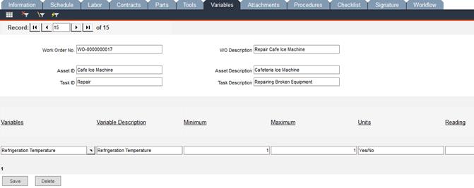 If the task associated with this work order has variable data attached to it, the Variables screen displays that variable information that you entered in the Tasks -> Variables tab. In this screen, you can edit the variable information to apply specifically to this work order.