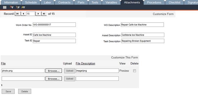 Use this tab to attach instance-specific documents to work orders, such as the asset’s warranty or service contract information, manuals, photos or special handling instructions. You can have all the information at your fingertips in the WO without having to reference the asset record.