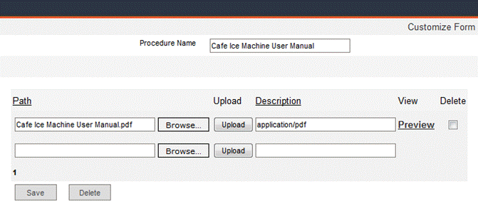 To add a new attachment, click the Browse… button to locate and select the file. Click Upload to upload the file to the database and the Description field will auto-fill. To view the attachment in a separate window, click Preview. Adding an attachment to a procedure in this window will add the attachment globally to the procedure, not just for the work order record you’re currently modifying. Click Save to save the attachment and close the window.