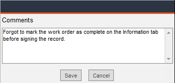 Comments: Any information that you enter in this field will also appear in work order history reports, work order cost reports and on the printed work order.