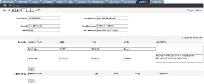 FaciliWorks will show the electronic signature details of each signing and unsigning of the record.