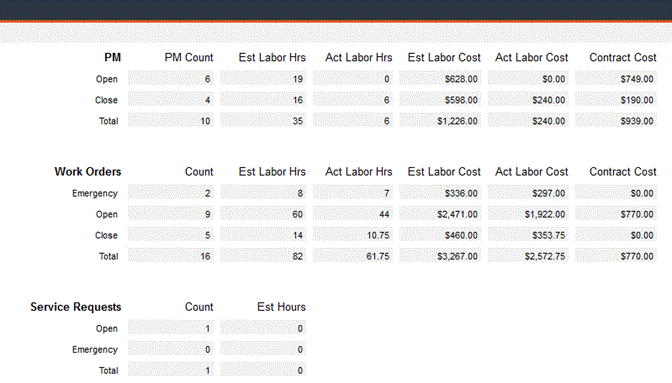 Navigate to Work Orders -> Maintenance Jobs Status to view a chart of work order, PM and service request information, including total counts open and closed of each and total labor hours, labor cost and contract cost. This form is not editable.