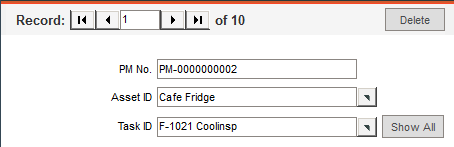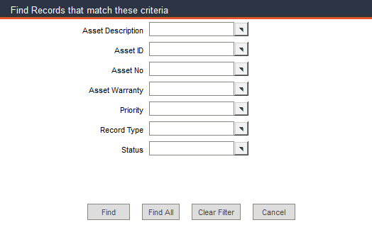 A pop-up list may be filtered depending on selections previously made on a form. For instance, the work order form allows you to choose an Asset ID from a pop-up list and beneath that is a corresponding Task ID field. Before selecting an Asset ID, the Task ID field has a Hide All button; all Task IDs are available. When you select an Asset ID, the list of Task IDs that are available is filtered; only those tasks that have already been attached to the asset when setting up PMs will be included in the list for the asset. The Task ID field will now have a Show All button that when clicked, will remove the filter from the Task ID pop-up list, making all tasks available for selection.