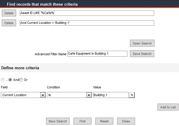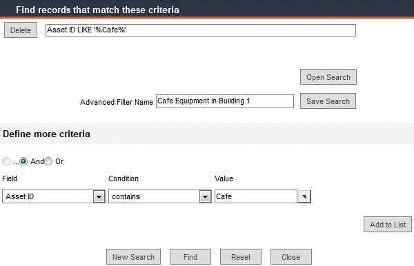 Suppose we want to access records for all cafe-related equipment located in Building 1. This can be done by defining the criterion using two field-value relations. Click the Advanced Filter icon to open the filter window. If you plan on saving your search for future use, enter a name for your search in the Advanced Filter Name field.