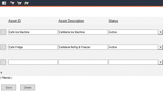 First, filter the asset records to display assets whose IDs contain the word Cafe. Use the Field drop-down list to select Asset ID. In the Condition field, use the drop-down to select Contains. In the Value field, type Cafe.