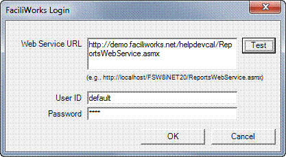 Click the Test button to ensure the information you entered is correct and then on the FaciliWorks Login window, click OK.