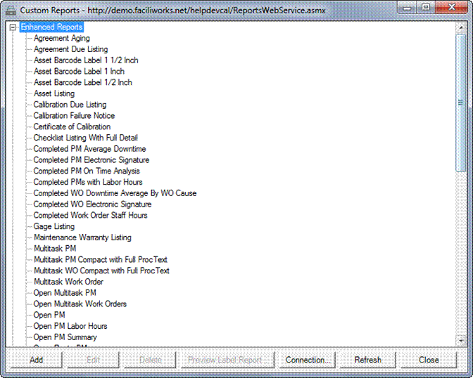 The Custom Reports window appears, listing all Enhanced and Standard reports contained in you 8i system.
