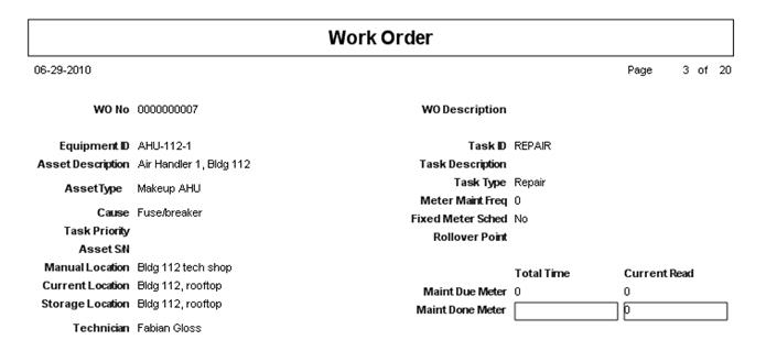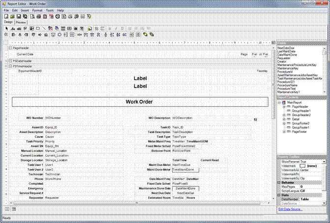 All of the reports in FaciliWorks are editable. Labels and fields can be added, moved, resized or deleted. For example, the Work Order report does not include the Asset Type field, but the report can be configured to add this field.