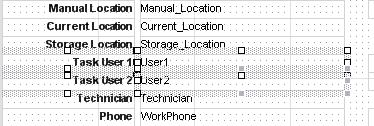 Now that you have created some space on your report, you can move the other fields to better position the Asset Type field. Suppose you want the Asset Type field to display under the Asset Description field. First, select both the label and placeholders for the Cause, Task Priority, Asset SN, Manual Location, Current Location and Storage Location fields (use the Shift key on your keyboard to select multiple fields). Release the Shift key.