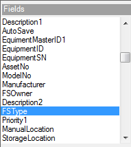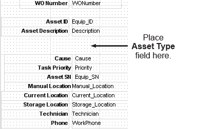 When the Work Order report was created, a query was used to select information from the database. The fields available in this query are listed in the Fields pane located to the right of the report canvas. Use the scroll bar to locate the Asset Type field. The name of this field in the database is FS Type. Click the FS Type field to select it. Release the mouse button.