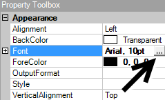 In the Property Toolbox, locate the Font property and click to highlight. Next, click the […] button to the right of this property.